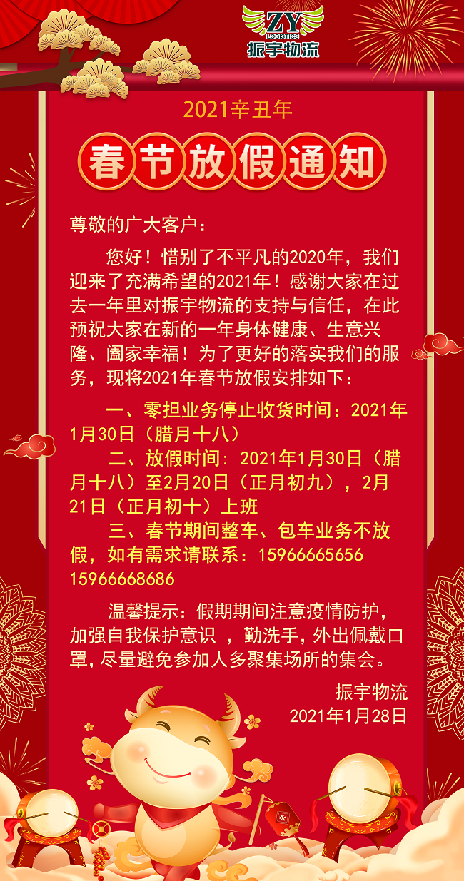 您好!惜別了不平凡的2020年,我們迎來了充滿希望的2021年!感謝大家在過去一年里對(duì)振宇物流的支持與信任,在此預(yù)祝大家在新的一年身體健康、生意興隆、闔家幸福!為了更好的落實(shí)我們的服務(wù),現(xiàn)將2021年春節(jié)放假安排如下: