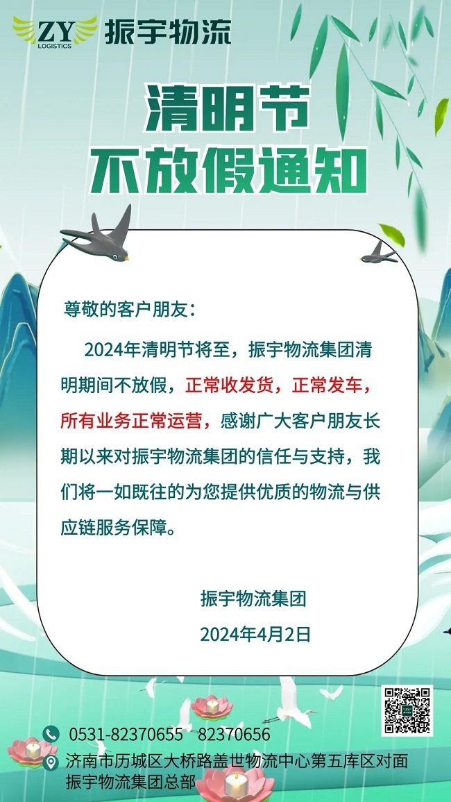 2024年清明節將至,振宇物流集團清明期間不放假,正常收發貨,正常發車,所有業務正常運營,感謝廣大客戶朋友長期以來對振宇物流集團的信任與支持,我們將一如既往的為您提供優質的物流與供應鏈服務保障。