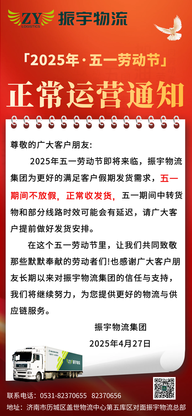 2025年五一勞動節即將來臨,振宇物流集團為更好的滿足客戶假期發貨需求,五期間不放假,正常收發貨,五一期間中轉貨物和部分線路時效可能會有延遲,請廣大客戶提前做好發貨安排。