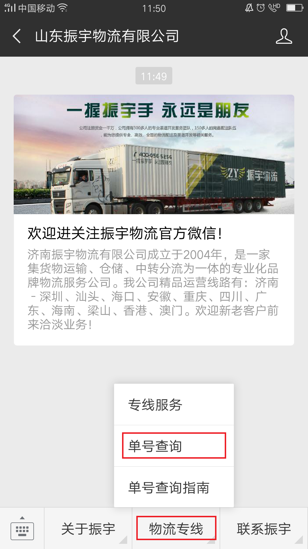 1.搜索“山東振宇物流有限公司”公眾號。
