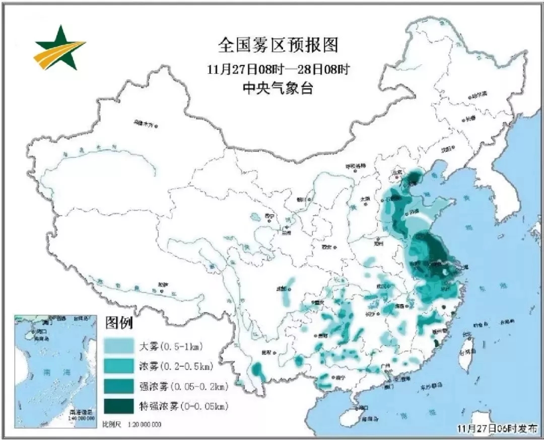 中央氣象臺11月27日06時繼續發布大霧橙色預警,27日早晨至28日早晨,華北中東部、黃淮東部和南部、江淮、江漢平原的部分地區將有大霧,其中河北東部、山東西南部、安徽東部、江蘇、上海、浙江北部等地有濃霧或強濃霧,局地有能見度不足50米的特強濃霧。預計華東地區的大霧天氣會一直持續到12月2日,長達一周。