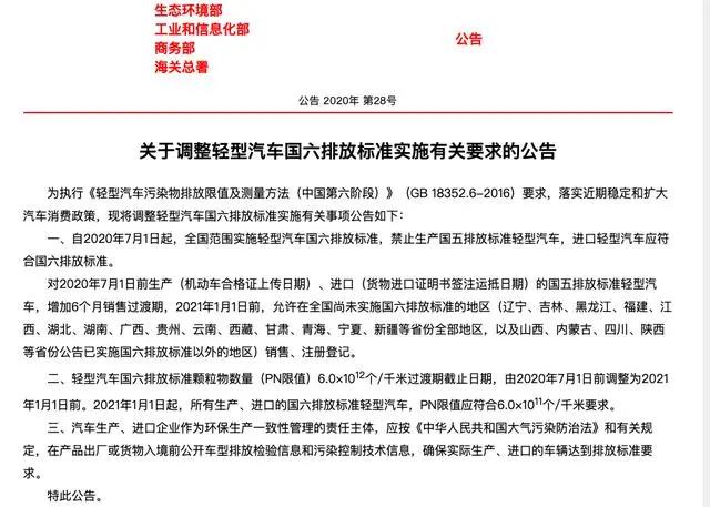 同時,公告表示,輕型汽車國六排放標準顆粒物數(shù)量(PN限值)6.0×1012個/千米過渡期截止日期由2020年7月1日前調整為2021年1月1日前。2021年1月1日起,所有生產、進口的國六排放標準輕型汽車,PN限值應符合6.0×1011個/千米要求。
